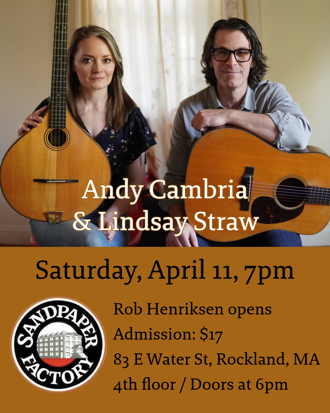 Saturday, April 11 at The Sandpaper Factory in Rockland, MA