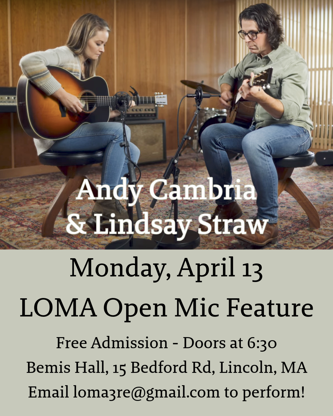 Monday, April 13 at the LOMA Bemis Hall Open Mic in Lincoln, MA